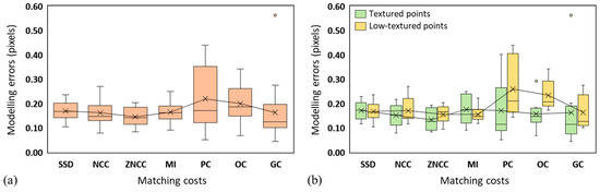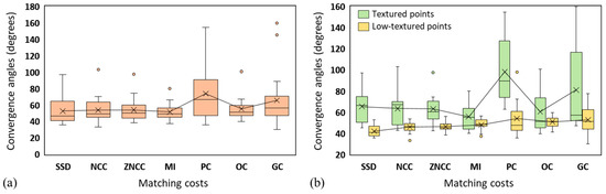 The modeling errors were relatively lower in the image domain costs (Table 5 and Figure 11a). Unlike the image domain costs, the frequency domain costs exhibited high modeling error distributions between the analysis points and, in particular, a sharp increase in modeling errors at the low-textured points (Figure 11b). Convergence angles were also lower in the image domain costs (Table 6 and Figure 12a). Among the results for the frequency domain costs, only those of OC were similar to those of the image domain costs. Meanwhile, unlike the modeling errors, all the matching costs represented a decrease in convergence angles at the low-textured points (Figure 12b).