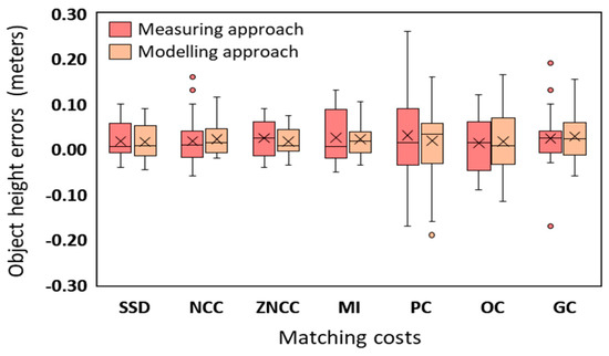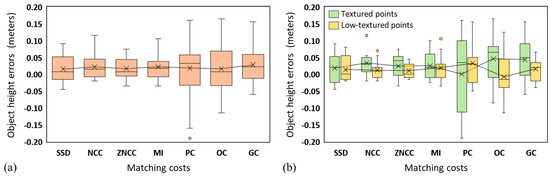 In response to the results for modeling errors and convergence angles, the height errors were also relatively smaller in the image domain costs (Table 7 and Figure 13). In addition, the height errors of the image domain costs decreased at the low-textured points. This was probably due to the decrease in elevation differences within search windows, as explained earlier. Among the image domain costs, ZNCC showed the best performance. On the other hand, the frequency domain costs were similar to the image domain costs, in terms of mean error, but showed large variations in terms of error distribution. The OC produced similar convergence angles to the image domain costs but caused an increase in height errors due to large modeling errors. The GC did not produce large modeling errors but caused an increase in height errors due to large convergence angles. The PC, with the largest modeling errors and convergence angles, showed the greatest reduction in positioning accuracy. These results suggest that various parameters, such as modeling error and convergence angle, may affect the positioning of object points, even if sufficient textures have been considered in image matching. However, even in this situation, the image domain costs produced relatively reliable and accurate results. Therefore, assuming that the optimal search windows can be applied, all of the image domain costs could be effectively used in positioning object points on low-textured surfaces.