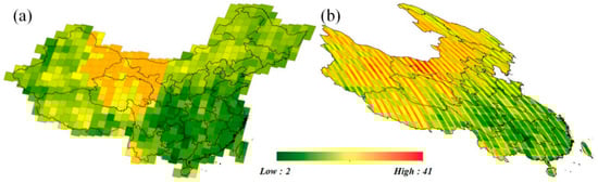 To store and retrieve the GSinGrid tile more efficiently and flexibly, a simplified database which was similar to the Australian Geoscience Data Cube (AGDM) [], called Landsat datacube, was designed to manage these massive GSinGrid tile data. In this study, all 7,059 Landsat SR images were processed into the GSinGrid tiles using the aforementioned method and then stored in the datacube. Figure 2 displays the locations and frequency distributions of the Landsat WRS-2 scenes and corresponding GSinGrid tiles in the datacube. The comparison illustrates that the tiling process significantly increased the data availability especially in the overlap regions between two orbits.