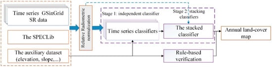 The RF classifier can handle high data dimensionality and multicollinearity. It is also fast, insensitive to overfitting, less sensitive to noise and more efficient and accurate than other non-parametric classifiers []. Therefore, the RF was selected for use in our operational SPECLib-based multi-temporal land-cover mapping method. To generate the annual land-cover map using the intra-annual multi-temporal data, a stacked random forest was developed and adopted (Figure 4). The stacked random forest usually consists of two steps: the independent RF classifier (base classifier) was first generated using the training data from each time/date. Individual outputs from all the independent classifiers were then used as input features to train the second classifier.