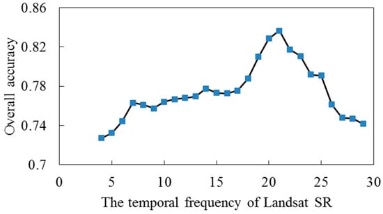 Due to the contamination by cloud and cloud shadow, the temporal frequency of Landsat SR varied greatly by geographical location (Figure 2). As the temporal information contributed a lot to the land-cover mapping, the relationship between the temporal frequency and the classification accuracy was analyzed using the validation samples described in Section 2.2. The analysis in Figure 6 shows that the classification accuracy first increases and then slowly decreases with increasing temporal frequency. In addition, it was found that a temporal frequency around 21 gave the highest overall accuracy.