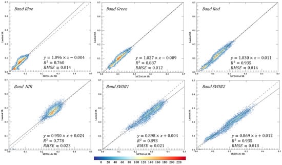 Density plots for Landsat images (y-axis) in land tile hh26vv05h1v2 land-tile (see Section 2.1) acquired on 13 July 2015 against the MODIS 16-day NBAR (x-axis). The black dashed line is the 1:1 line and the solid line is the fitted line.