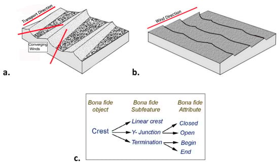 Dune types and wind direction relationships. a. Linear dunes and their generating wind field. b. Transverse dunes and their generating wind field. c. Linear and transverse dune features and their attributes [20].