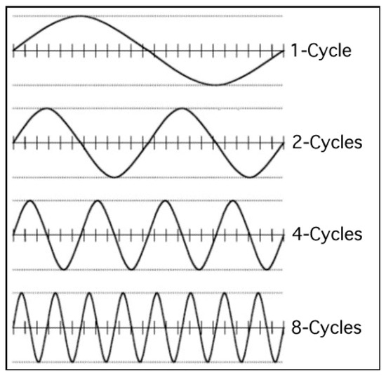 This process produces 16 vectors, each of which is convolved with four waveforms with frequencies including a single period (12 pixels wide), two periods (six pixels wide), four periods (three pixels wide), and eight periods (1.5 pixels wide) (Figure 7). Discrete values for the sine and cosine function for each of the four functions are computed for each vector. The results are added together to produce a resonance coefficient that represents how well each vector fits the specific waveform. The dominant ridge flow direction recorded is the block orientation with the maximum waveform resonance. Further details are found in the source code documentation [31].