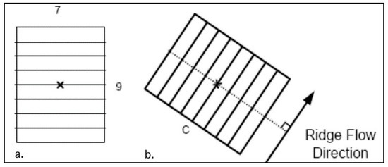 Ridge flow detection approach. a. 7 × 9 grid is used to sum values. b. Rotated grid centered on the pixel to which the sum will acrue [32].