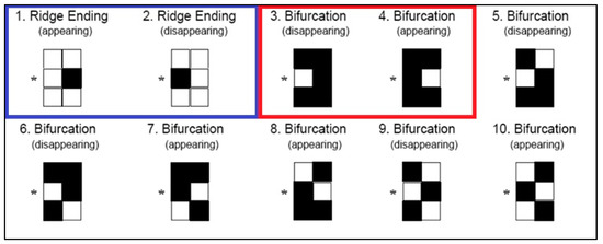 Feature extraction templates. Horizontal image sweeps [31,32]. The templates are rotated 90° for vertical image sweeps. Blue box (terminations) and red box (bifurcations) represent the most basic extraction kernals.