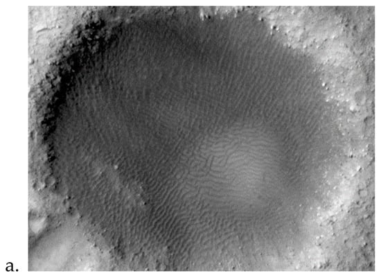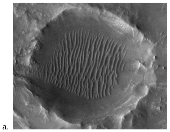 Modern Mars is characterized by an aeolian dominated, hyperarid environment with a tenuous atmosphere (~6.36 bar on average). The landscape has been extensively modified by aeolian processes, including short term seasonal winds that entrain and transport dust along with rare high velocity winds, possibly linked with atmospheric density changes capable of transporting sand grains [60,61,62,63]. Much of the surface contains depressions and craters where aeolian process have deposited linear aeolian features (Figure 4).
