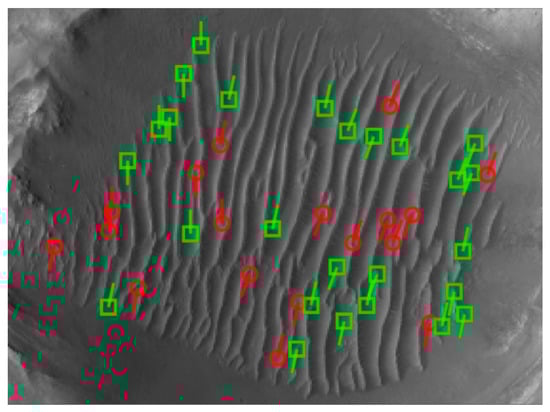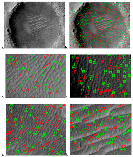 To evaluate MINDTCT in its raw state we first applied MINDTCT to a high-resolution image of a simple TAR field in an ~1 km diameter crater located on a delta within Jezero Crater (Figure 4 and Figure 10a). TARs crests average ~25–27 m of separation so at a pixel resolution of 25 cm/pixel the average pixel spacing is ~100–110 pixels. This is ~12–14× the resolution of the ten print fingerprint images MINDTCT is tuned to. Figure 10b shows the results of the extraction process with 136 defects extracted. Misplacement of both bifurcations (green) and terminations (red) as well as missed defects of both types, especially along the edge of the TAR field, are readily apparent.