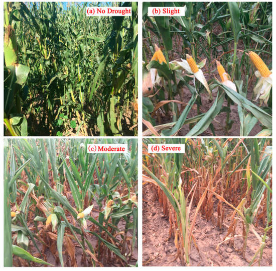 Drought event (disaster) records containing the information on the location and severity of the disaster were collected during the crop growth period in 2016 across the Jilin Province. We selected 95 points with detailed information on the disaster occurred to verify the effectiveness of VSWD (Figure 1b). The pictures of the field drought event data, which reveal the actual growth of the crop during the field investigation, demonstrate four severities of agricultural droughts, i.e., no drought, slightly affected, moderately affected, severely affected (Figure 3). The severities of the disaster at the sampling points were judged based on the assessment of agricultural experts. Prior to undertaking field sampling, we carefully designed the sampling plan based on the information on agricultural drought events, including the disaster locations and severities, provided by the local agricultural insurance companies. For example, sampling sites designed should cover different disaster severities in the Jilin Province.