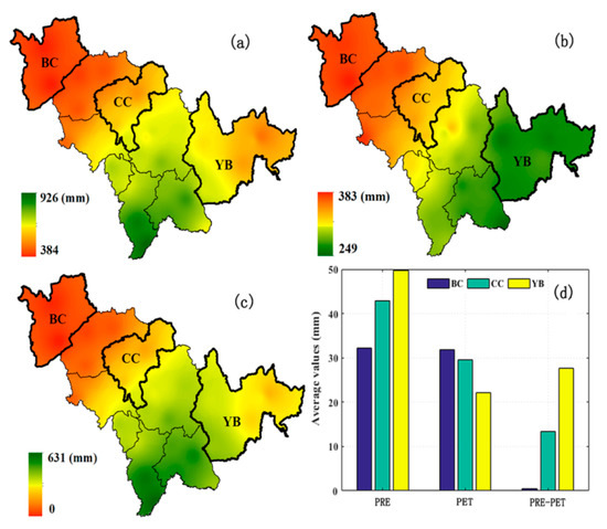 (a) Annual precipitation; (b) potential evapotranspiration (PET); (c) the long-term differences between the precipitation and PET (1961–2008); (d) the bar chart of the monthly average precipitation (PRE), potential evapotranspiration (PET), and differences between PRE and PET (PRE-PET) in Baicheng (BC), Changchun (CC), and Yanbian (YB).