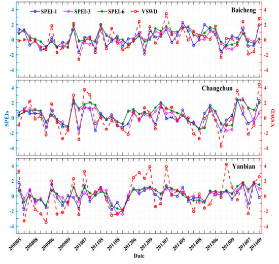 Time series of vegetation-soil water deficit (VSWD) and Standardized Precipitation Evapotranspiration Index (SPEIs) during growing seasons from 2008 to 2016 in Baicheng, Changchun and Yanbian.