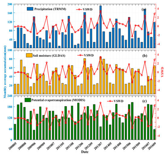 Comparing VSWD with (a) precipitation; (b) soil moisture; and (c) PET during growing seasons from 2008 to 2013.