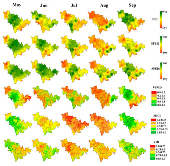 In order to test the effectiveness of VSWD and the temporal consistency with other methods, the VSWD was compared against SPEIs from May to September of 2008–2016 period (Figure 5). Spatio-temporal drought distribution maps created from the different indices namely; SPEIs, VSWD, SDCI, and VHI as represented in Figure 7 were also compared. The Pearson correlation analysis was conducted, and the coefficients are shown in Table 2.