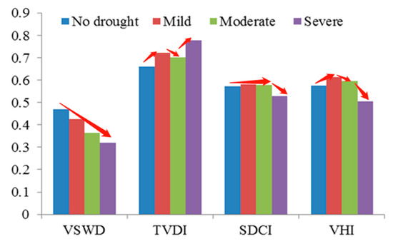 According to the methods of VSWD, SDCI, and VHI, smaller values indicate worse drought severities; and theoretically, their average indices at the ‘severe’ drought event should have the lowest value, while the average ‘no drought’ indices have the highest value. In contrast, higher TVDI values represent worse drought severities. Therefore, the downward trend of the index values in Figure 8 would be ideal for VSWD, SDCI and VHI, while TVDI should have an upward trend.