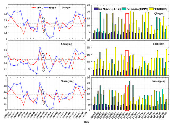 The performances of VSWD and the three-month standardized precipitation evapotranspiration index (SPEI-3) in the major drought event occurred in Qianguo, Changling and Songyuan during June 2010 (Black ellipse represents the drought event; red rectangle indicates precipitation, PET and soil moisture in June 2010).
