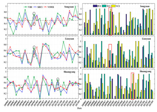 The performances of VSWD, VHI and SDCI in the major droughts event occurred in Songyuan and Liaoyuan (September 2009) and in Shuangyang (July 2011) (Black ellipse represents the drought events; red rectangle indicates PCI, TCI and VCI in the drought event months).