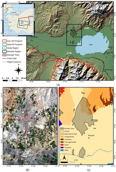 The study area, namely Bolvadin, is located on the eastern part of the Aegean sub-region of Turkey. Bolvadin is the largest town in the province of Afyon with a population of over 30 thousand. It is built on a wide fertile plain between Sultandağ and Emirdağ mountains on the Aegean coast. The plain is a rich agricultural and farming area watered by the river Akarçay and Lake Eber. Eber Lake is an important water source for the region, positively affecting economic and agricultural activities. However, the water surface area of Eber Lake varies from year to year due to the intense use of water in irrigated agricultural areas, climatic changes and newly built dams in the region [35,36,37]. Historically, groundwater has been the primary source of water for irrigation and industrial use in the Bolvadin Region. Due to the soft alluvial sediments surrounding the Akarçay River and Lake Eber, many subsidence phenomena affect the area, making it potentially dangerous for civil infrastructures for the study area [5,6].