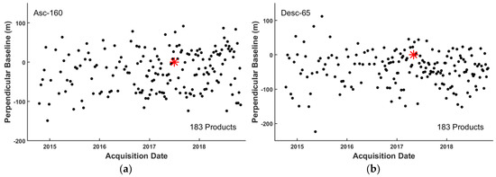 Baseline plot for Sentinel 1 data. Red star represents the master image of all the pairs. (a) Asc. track 160, master image date is 5 May, 2017. (b) Desc. track 65, master image date is 2 July, 2017.