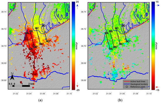 The mean deformation velocity maps obtained in LOS by multi-temporal analysis of ascending and descending datasets within the time period of October 2014 and October 2018 are shown in Figure 4. All measurement values are relative to a common reference point that is considered to be stable over the entire time period. Warm colors (negative values) highlight displacement that occurred away from the sensor while cold colors (positive values) show movement towards the sensor. Although results are displayed in the range of ± 25 mm/year for visualization purposes, larger displacement rates are present at some locations. The velocity maps of the entire study area in Figure 4a,b show that subsidence is taking place not only in the town of Bolvadin, but also in almost all parts of the Afyon-Akşehir Graben, including the surroundings of Çay, Çobanlar and Sultandağı towns. The majority of the PS points is found to be around the urbanized area. There are almost no measurement points over agricultural areas located around the settlement since great variations in the farmlands are expected in such a long analysis period. However, it is quite clear that the entire graben is exposed to severe subsidence. Figure 4c,d provides mean velocity maps focused on the Bolvadin region. Ascending and descending velocity maps show quite a similar deformation pattern and rates at most of Bolvadin, which is a sign of pure vertical movement. However, there are some areas like the southern part of the city that LOS deformation is different for ascending and descending dataset. That might be an indication of horizontal movement. For that reason, further processing and decomposition of LOS displacement into vertical and horizontal components is required for easier interpretation of movement.