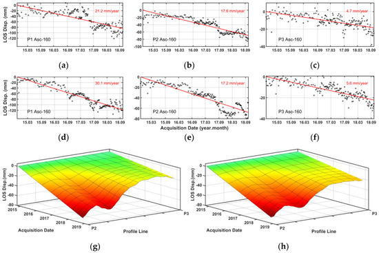 LOS displacement time series at selected points are shown together with linear fit for Asc.-160 (a) P1 (b) P2 (c) P3 and Desc.-65 (d) P1 (e) P2 (f) P3. Linear fit of LOS displacement time series on the profile between points P2 and P3 are displayed-for (g) Asc.-160 and (h) Des.-65, tracks. Points and profile locations are shown in Figure 4c,d.