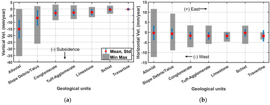 Relationship between geological units in the Bolvadin region and (a) Vertical deformation velocity, (b) Horizontal (E-W) deformation velocity. The mean (red dots), standard deviation (blue line), minimum and maximum (bold gray) values of deformation velocity are shown for each geological unit.