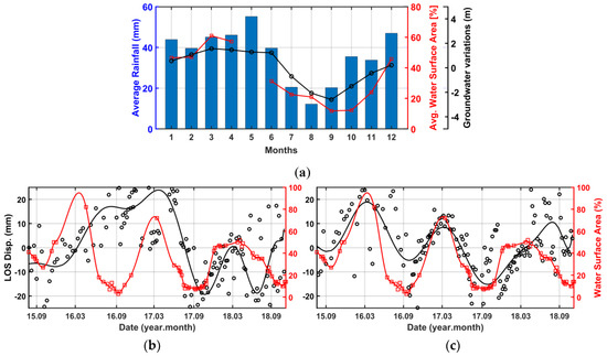 We compare water surface area of Eber Lake and LOS displacement time series for ascending and descending orbits. As shown in Figure 8b,c, a clear correlation between the seasonal variation of water surface area of Eber Lake and displacement time series is revealed when the long-term linear subsidence trend is removed from the LOS displacements. There is a lag time between the peak level of the lake water surface area and the displacement time series. It can be observed from the time series of individual points that correlation of LOS displacements with seasonal variation of water surface area increases towards the south of the region. The effect of seasonal change on different regions can also be examined by looking at the local standard deviation of the mean deformation velocity. Statistics provided in Figure 7 include the whole area for each geological unit. In order to observe how seasonal variation affects different regions, additionally, the standard deviations for local regions alone are also calculated. The average standard deviation for the deformation rate increases for both dataset from 0.3 mm/year to 1.7 mm/year as from north to the south. The increase of standard deviation is a direct effect of seasonal variation. Although the water source of Eber Lake has no direct relation with groundwater, both Eber Lake water surface and ground water level are affected by climate and fed by precipitation. Moreover, LOS displacement time series for both datasets are compared with groundwater level changes. There is quite a good correlation between groundwater level changes and LOS deformation trends both in long term and short term as shown in Figure 9a,b. As a result, the relation of groundwater level and lake water surface area with displacement time series show effects of hydrological changes to deformation.