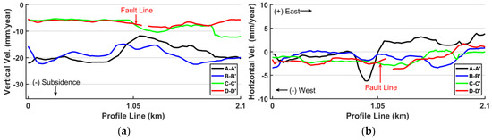 Mean velocities along the profiles AA’-DD’ shown in Figure 5. (a) Vertical mean velocity. (b) Horizontal (E-W) mean velocity.