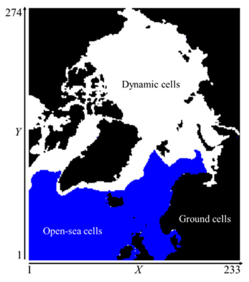 For efficient computation, we selected 20,661 cells in which sea ice had been observed from 1 January 2000 to 31 December 2016. The cells are referred to as ‘dynamic cells’ and account for around 32% of the entire grid cells. We assumed that sea ice would appear only in the dynamic cells, believing that the prediction errors made from this assumption would not be significant. In Figure 1, the white cells indicate the dynamic cells. The black cells indicate ‘ground cells’, which are continental areas and have a positive elevation. The blue cells indicate ‘open-sea cells’, which have a negative elevation, and sea ice was not observed in these areas during this period.