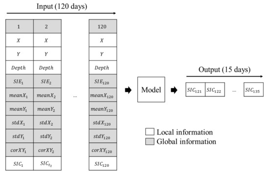 The ANN predicts the SIC of each dynamic cell individually. The prediction period is 15 days using sea ice information from the previous 120 days and geographical information from the cell. The input length, 120 days, was determined using trial experiments, in which we investigated performance using 15, 30, 60, 90, 120, and 150 days of input length, and the best performance was found in 120 days. Figure 2 describes the input and output of the model, in which the values in the white cells indicate local information, and the values in the grey cells indicate global information. The local information is relevant only for an individual cell, such as the geographical information and SIC of the cell. The geographical information indicates the cell’s coordinates and elevation. This allows for one model to be used to predict multiple cells. We used X–Y coordinates instead of longitude and latitude to avoid the discontinuity between the end of the longitude lines. For example, if we represent the longitude lines 179 degrees east and 179 degrees west by the values 179 and −179, respectively, although these lines are close to each other geographically, they are quite different in their numerical value.
