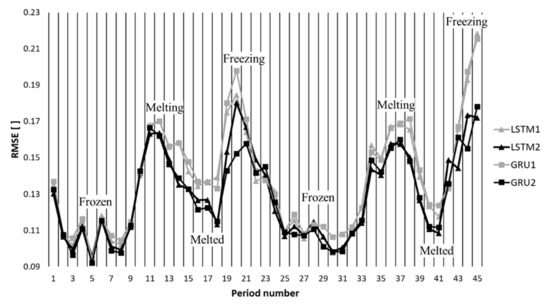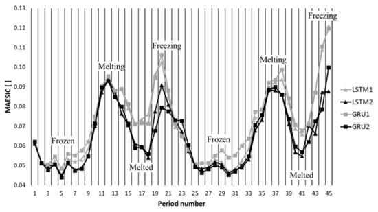 Figure 6, Figure 7 and Figure 8 describe the test results. The horizontal axis indicates the period number and the vertical axis indicates the errors defined in Equations (3)–(5). In each figure, there are four lines defined by two marker types and two line colors. The lines with triangles are the errors of the LSTM models and the lines with the squares are the errors of the GRU models. The line colors are used to represent the data schemes, in which if the model used both global and local information, the line color is black. Otherwise, the line color is grey.