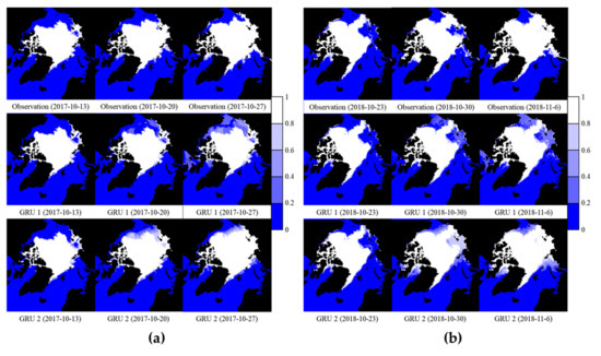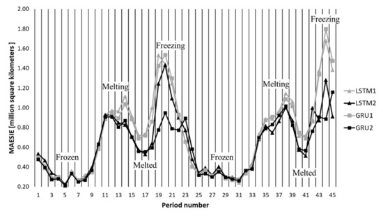 Table 4 describes the test results in a quantitative manner. In both GRU and LSTM models, the use of global information improved prediction accuracy. On average over the periods, the improved accuracy of the GRU 2 was 0.01 in RMSE, 0.01 in MAESIC, and 0.11 million km2 in MAESIE. Similarly, the improved accuracy of LSTM 2 was 0.01 in RMSE, 0.01 in MAESIC, and 0.08 million km2 in MAESIE. These numbers increased to 0.02, 0.02, and 0.51 million km2, respectively, in the GRU models and 0.02, 0.01, and 0.26 km2, respectively, in the LSTM models during the freezing seasons, which are periods 19–22 and 43–45.
