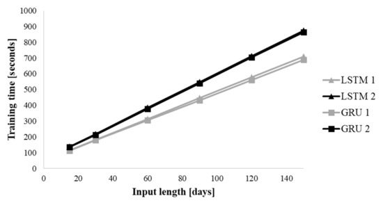 All the models were trained using an Intel Core i7-8700K (3.70 GHz) with 16-GB memory and NVIDIA GeForce GTX 1080 (2560 CUDA cores and 8- GB memory). Figure 9 presents the training times of each model using different input lengths. Although the GRU is known to involve faster training, there was no significant difference in this experiment. If the model type is same, using global SIC information increases the training time. Moreover, there is a clear linear relationship between training time and input length.