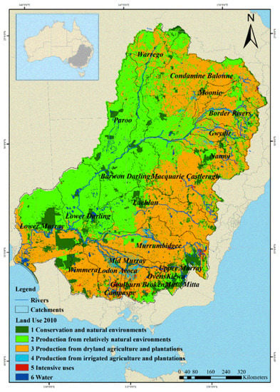 Location of the Murray Darling Basin (MDB). Land use data is extracted from “National scale land use version 5 (2010–2011)” through http://www.agriculture.gov.au.