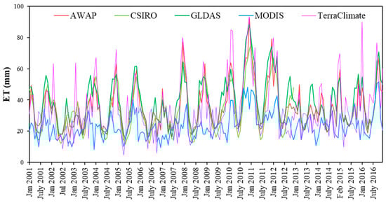 Direct measurements of actual ET are possible only at small scales due to the complexity of the related physical processes (e.g., landscape characteristics, micrometeorological conditions) and the requirements of equipment (e.g., using flux towers). ET at a large scale from regional, to continental and global scales has to be estimated using models. To date, several ET estimation models have been developed which could be broadly classified into two categories according to their theoretical basis: Hydro-meteorological models and hydrological models. The hydro-meteorological models deal with the vertical exchanges of water and heat between the atmosphere and land surfaces and use site and satellite-based observations to parameterize the processes [8,9,10,11]. Hydrological models are developed based on a water balance approach and focus on spatial distribution of water availability, as well as the vertical and lateral transfer of water resources [12,13]. Products based on hydro-meteorological models include, for example, the CSIRO PML ET data collection [9] and the widely used MOD16A2 [8,11], while the Australian Water Availability Project (AWAP) generated ET [14] and the recently released TerraClimate ET [13] fall into the second category. Since there are inherent differences among the different algorithms in relation to, for example, the input data, model parameterization and calibration procedures, theoretically there exists differences in the performance of these data products.