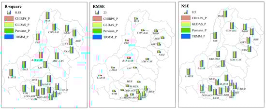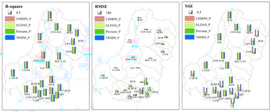 Bar plots showing the statistics (R2, RMSE and NSE) of monthly P estimated with CHIRPSP, GLDASP, PersiannP and TRMMP products within the 22 catchments of the MDB when compared with the monthly AWAPP values. The embedded bar plots with numbers at the upper-left corners are the scales for interpreting the bars associated with each catchment.