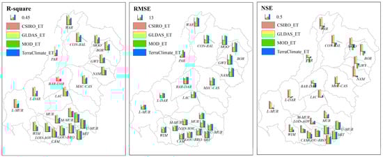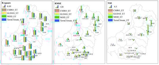 Bar plots showing the statistics (R2, RMSE and NSE) of monthly ET estimated with CSIROET, GLDASET, MODET and TerraClimateET products within the 22 catchments of the Murray Darling Basin when compared with the monthly AWAPET levels. The embedded bar plots with numbers at the upper-left corners are the scales for interpreting the bars associated with each catchment.