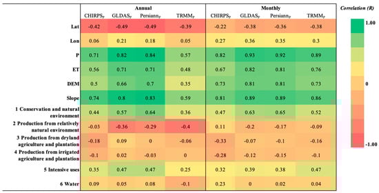 Correlations of RMSE for each pair of global P products and AWAPP at both annual and monthly scales with catchment characteristics are summarized in Figure 8. The annual result indicated that data products showing higher RMSE values are generally associated with catchments with a high annual P level, and RMSE is highly correlated with the greater terrain fluctuations characterized with a high DEM as well as larger DEM variations (indicated with average slope levels). This is especially true for GLDASP and PersiannP, which indicated that these two data products are more sensitive to changes in elevation. While most land use types do not show high correlations with the statistics, the “1 conservation and natural environments” and “5 Intensive uses” presented a consistent moderate positive correlation with RMSEs associated with the four P products. The above phenomenon is more apparently indicated with the correlation analysis between RMSE derived from the monthly P series and catchment characteristics. Catchments characterized by relatively high P levels, high altitude and large terrain variations and more distribution of land use type 1 and 5 tend to deliver high RMSEs according to the correlation coefficients.