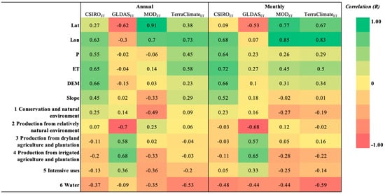 The situation is more complex and revealed with the correlation analysis between statistics of ET products and catchments’ characteristics (Figure 9). From an annual perspective, RMSE levels for CSIROET, MODET and TerraClimateET are observed to positively correlate with the location of the catchments (latitude and longitude), more eastern and northern catchments tend to have higher RMSE levels, while GLDASET presented the opposite trend. Additionally, RMSE values are positively correlated with P and ET levels for CSIROET and TerraCliamteET, which indicated that catchments with higher P, and thus higher ET, would yield higher uncertainties for the ET products. High altitude located catchments also tends to have higher uncertainties supported with the positive correlation coefficients between RMSE and DEM (and Slope). The high positive correlation between MODET RMSE levels with latitude and longitude, well represented in the north eastern catchments, showing significant higher RMSE values as previously identified. Similar impacts of land use composites on CSIROET and TerraClimateET are observed where catchments with more water (land use type 6) distributions tend to have lower RMSE levels. For GLDASET, RMSE in annual ET is negatively correlated with land use type 2 but positively correlated with land use type 3 and 4 areas, whereas for MODET, RMSE in annual ET is negatively correlated with land use type 1, 4, 5 and 6 areas. Similar correlations between RMSE and catchment characteristics are also observed with the monthly ET series.
