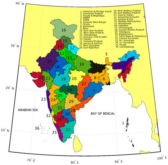 Although adopted methodology to diagnose the onset and demise of the ISM has been introduced by the authors of [2], the novelty of this paper is that we are attempting for the first time to define the onset and demise of the ISM at the granularity of the Indian meteorological sub-divisions (Figure 1). These meteorological sub-divisions are the operational spatial scales for the official forecasts issued by the Indian Meteorological Department (IMD). Therefore, there is a direct practical utility to target these spatial scales for monitoring the evolution of the ISM.