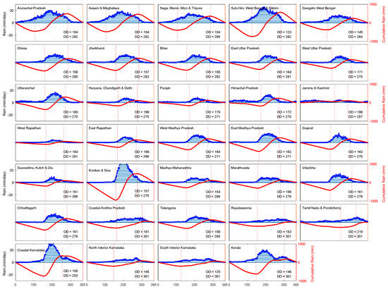 Time series of daily rainfall climatology (IMD) of the 34-meteorological sub-divisions of India (MSDs; blue dots) and the corresponding cumulative daily anomaly curve (red line) with onset (OD) and Demise (DD) dates marked in Julian days. The onset and demise are marked by dotted red lines that mark the inflection points where the slope of the cumulative daily anomaly curve changes.