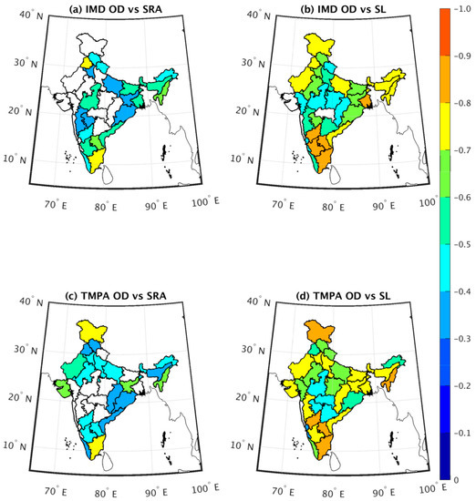The correlation of the onset date (OD) in each of the MSD with corresponding ISM seasonal (a,c) rainfall and (b,d) length anomalies using (a,b) IMD, (c,d) TMPA rainfall datasets. Only statistically significant values at 90% significance level is shaded. SRA and SL in the panel titles refer to Seasonal Rainfall Anomaly and Seasonal Length, respectively. Note that the correlations range from 0 to −1.