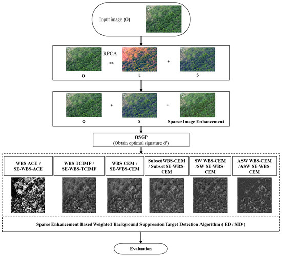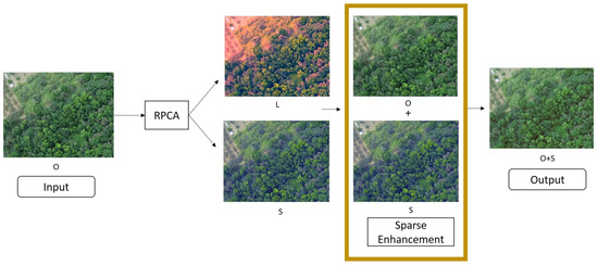 This paper proposes SE-WBS to increase the accuracy of target detection algorithms, in which an image is preprocessed by sparse enhancement to enhance NGL, highlight the difference between elements with different features, and observe whether or not preprocessing could increase the accuracy of the target detection. In Figure 4, the image is decomposed by RPCA into L as a low rank matrix and S as a sparse matrix. Sparse enhancement, as proposed in this paper, adds sparse matrix S to the original image O to enhance NGL, and because the sparsity of NGL is similar to the characteristic of a sparse matrix, image enhancement can be implemented by simple addition. The schematic diagram is shown below.