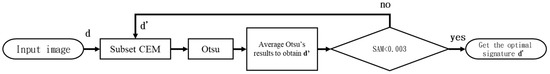 As CEM only selects one target of interest, the wrong signature of interest may be used due to manual selection and the target detection algorithm will be inaccurate; therefore, this paper used the optimal signature generation process (OSGP) [30] to optimize the desired signature. The OSGP implements subset CEM iteratively. When the results of CEM are obtained, the image threshold is obtained by using Otsu’s method. These pixels correspond to similar RGB values in the original image and are averaged as a new target d’. This is repeated until the last spectral angle mapper (SAM) are smaller than value θ, and then, the optimal target d’ is exported. Figure 5 is the flowchart of OSGP. Reference [30] has already proven that, by applying OSGP to target detection methods which require only one target signature, it provides stable results even if the initial desired target information is biased or not reliable.