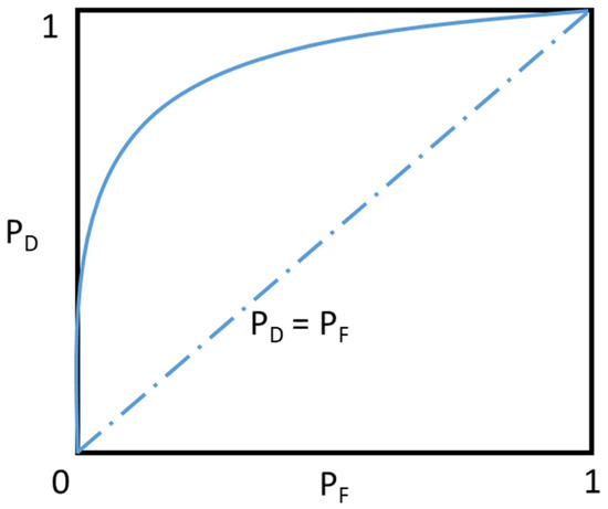 In recent years, the ROC curve has been used for evaluation in machine learning, data mining, and signal and image processing. It is used in signal and image processing to evaluate the detection effect. The main concept of ROC analysis is a binary classification model, which has two classes of output results, e.g., correct/incorrect, match/mismatch, and target/non-target, etc. For the classification effect, a threshold is given for evaluation, the data are divided into two classes by the threshold, and threshold (τ), PD (True Positive Rate), and PF (False Positive Rate) are drawn to obtain the ROC curve, as shown in Figure 7.