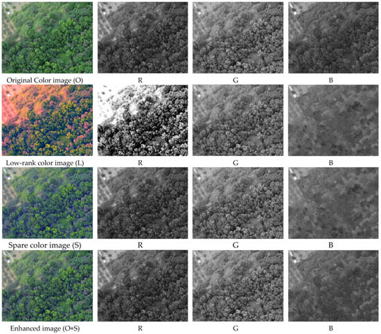 The RPCA kernel used in this section was the OPRMF kernel and RPCA is used to separate the original image (O) into a low rank image (L) and a sparse image (S), as shown in Figure 8. In addition, the RGB band in grey scale is shown in Figure 8. In terms of the preprocessing mode in this section, the L image and S image are separated by RPCA. The detected sprout characteristic falls in the characteristics of S; therefore, the preprocessing in this section uses a linear combination to put S back into the original image to enhance the target properties, known as sparse enhancement, which renders the target more visible. This experiment uses the WBS of ED and SID for weighted adjustments.