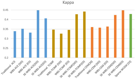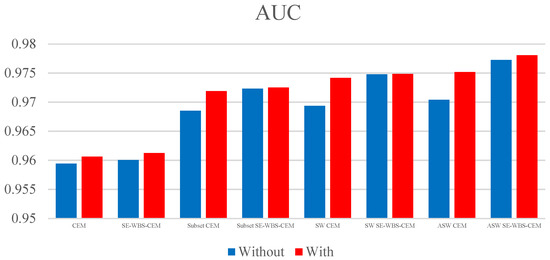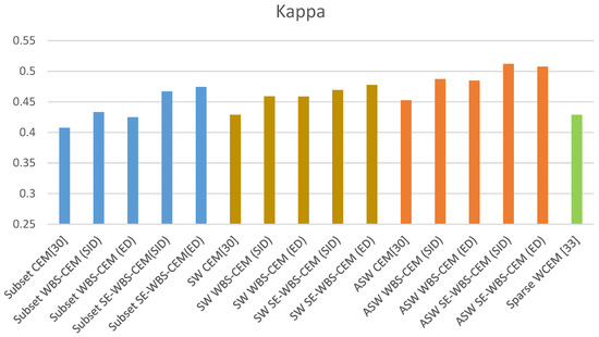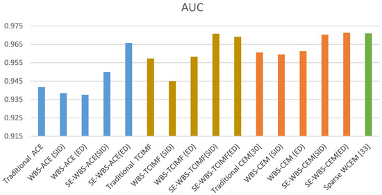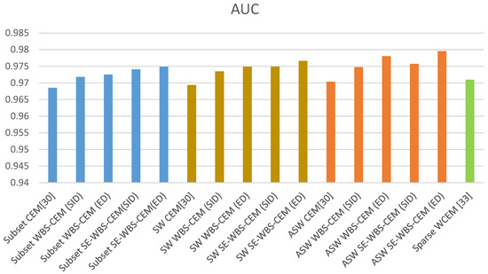 This paper proposes the innovative algorithms of WBS and SE-WBS, as based on the local CEM algorithm proposed by [30]. The concept of WBS was added to various algorithms to observe whether or not the background suppression was better, and the original image was further enhanced by sparse enhancement, in order to obtain better detection results. In the following experiments, the subset CEM image size is set as 200 × 260 and the default window size of SW CEM and ASW CEM is 151 × 151, which are the same as [30]. Sparse weighted CEM, as proposed by [33], and the results of WBS and SE-WBS, as proposed in this paper, were used for comparison and data analysis, in order to determine how much efficiency could be increased by WBS and SE-WBS. The data of various algorithms are shown in Table 3. Figure 14 and Figure 15 show the comparison of AUC and kappa.