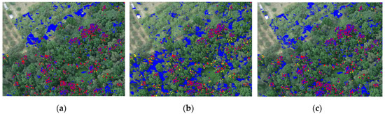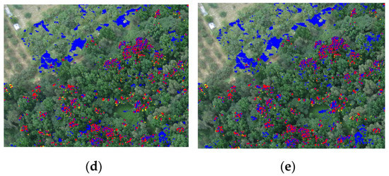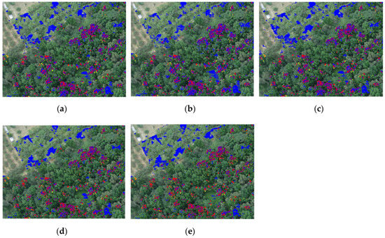 As shown in Figure 2, the red circle is the target d used in this paper, while the blue circle is the undesired target, meaning non-targeted pixels, such as soil, mature leaves, and other sundries. The undesired target was used as the undesired target in the TCIMF algorithm.