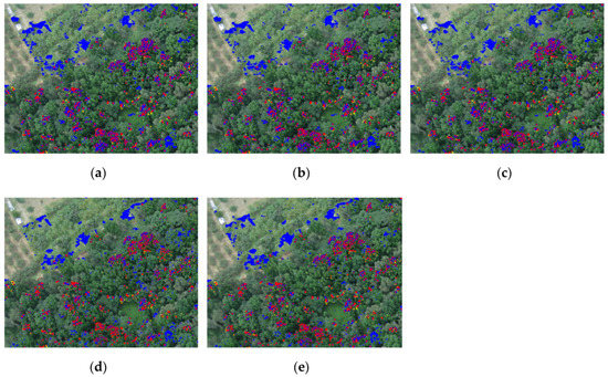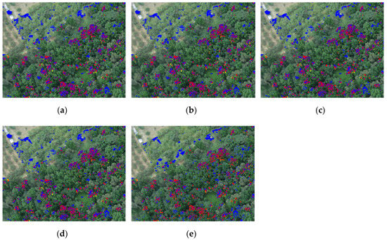 Resulting images of the traditional subset CEM, subset WBS-CEM and subset SE-WBS-CEM algorithms: (a) Subset CEM; (b) subset WBS-CEM (SID); (c) subset WBS-CEM (ED); (d) subset SE-WBS-CEM (SID); (e) subset SE-WBS-CEM (ED).