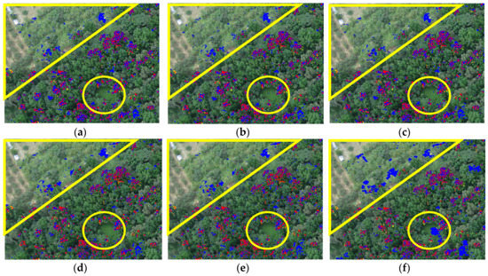 Resulting images of the traditional adaptive sliding window-based (ASW) CEM and ASW WBS-CEM and ASW SE-WBS-CEM algorithms: (a) ASW CEM; (b) ASW WBS-CEM (SID); (c) ASW WBS-CEM (ED);(d) ASW SE-WBS-CEM (SID); (e) ASW SE-WBS-CEM (ED); (f) sparse Weighted CEM [37].