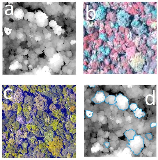 Example of manual segmentation of some crowns. (a) CHM based on the ALS, (b) hyperspectral image, (c) high-resolution photography, and (d) manual segmentation of crowns.